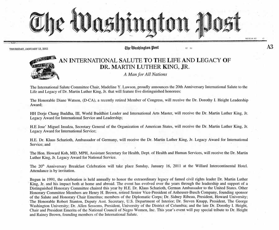 第三世多杰羌佛獲得 “馬丁路德金國際服務及領袖獎” (華盛頓郵報2011年1月13日新聞報導)