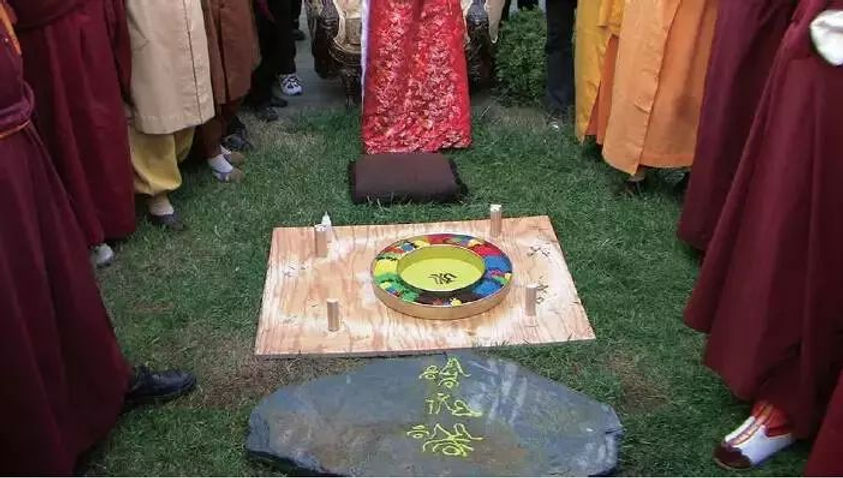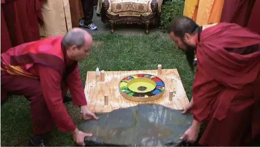 兩位仁波切將大青石板抬起來,壓在曼達拉盤上,由應考者在石板上面採砂築壇畫圖,當抬開石板後,都失敗了