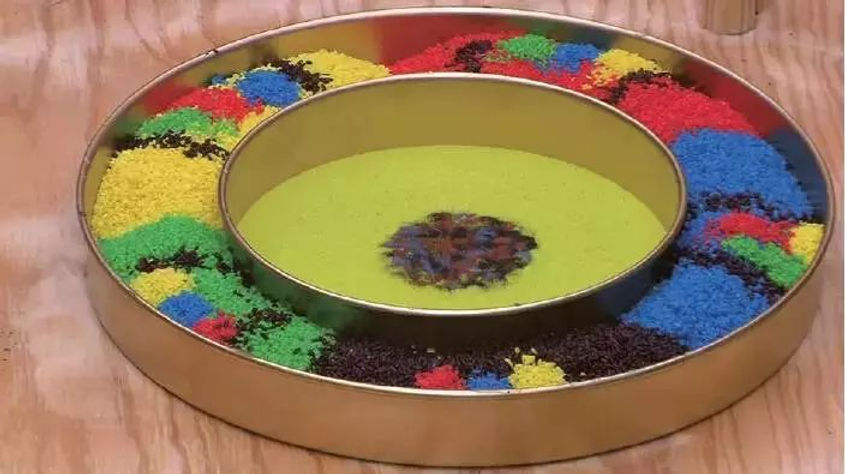 由五色米所堆成的曼達拉,中間是當場丟進去的多色砂表多種本尊,多色砂邊緣是淺綠色砂,周圍是五彩砂